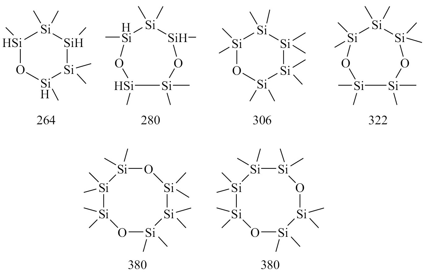 В образце Отг 3 обнаружены 3 соединения, имеющие одну массу (280) и одно название в базе NIST 11 [24], но разные времена удерживания. Это может свидетельствовать не только о разном расположении атомов кислорода в кольце, но также о размещении атомов кислорода между метильной группой и кремнием. В образце Отг 2 обнаружены соединения, представленные на схеме 8. Они представляют собой циклы, содержащие атомы кислорода, при этом ни в одном из них не присутствуют фрагменты MeHSiCH2 с метиленовыми группами. Предполагается, что такие соединения с кислородом могли образоваться при термолизе полидиметилсилана в результате использования электрокорунда в качестве катализатора.