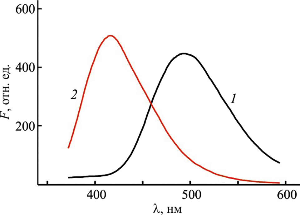 Рис. 4. Спектры флуоресценции образцов 15 (1) и 16 (2) в растворах ДМФА (с = 2·10–6 моль/л, ширина щели возбуждения – 5 нм, ширина щели излучения – 5 нм).