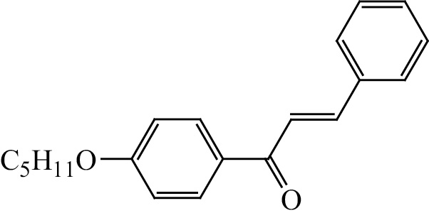 (E)-1-[4-(Пентилокси)фенил]-3-фенилпроп-2-ен-1-он (2). Выход 71%, т. пл. 87–88°С. ИК спектр, ν, см–1: 1657 (C=О). Спектр ЯМР 1H, δ, м. д. (J, Гц): 0.96 т (3H, CH3, J 7.1), 1.35–1.53 м (4H, CH2), 1.75–1.85 м (2H, CH2), 4.05 т (2H, ОCH2, J 6.5), 6.93–6.98 м (2Н, C6H4), 7.35–7.44 м (3H, m,p-C6H5), 7.67 д (1Н, CH=CH, J 15.6), 7.71 д (1Н, CH=CH, J 15.6), 7.70–7.75 м (2Н, o-C6H5), 8.02–8.07 м (2Н, C6H4). Cпектр ЯМР 13С, δС, м. д.: 13.5 (CH3), 21.8 (CH2), 27.5 (CH2), 28.2 (CH2), 67.4 (ОCН2), 113.7 (2CН), 121.6 (CH), 128.0 (2CH), 128.2 (2CH), 129.4 (CH), 130.2 (2CH), 134.7, 142.5 (CH), 162.2, 186.3 (CО). Найдено, %: С 81.36; Н 7.50. C20H22O2. Вычислено, %: С 81.60; Н 7.53.