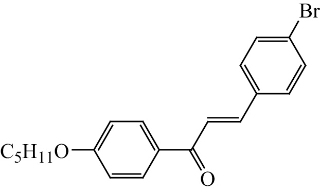 (E)-3-(4-Бромфенил)-1-[4-(пентилокси)фенил]проп-2-ен-1-он (4). Выход 70%, т. пл. 132–133°С. ИК спектр, ν, см–1: 1658 (C=О). Спектр ЯМР 1H, δ, м. д. (J, Гц): 0.96 т (3H, CH3, J 7.1), 1.34–1.52 м (4H, CH2), 1.75–1.85 м (2H, CH2), 4.04 т (2H, ОCH2, J 6.5), 6.93–6.98 м (2Н, C6H4ОAm), 7.56–7.56 м (2H, C6H4Br), 7.62 д (1Н, CH=CH, J 15.6), 7.66–7.70 м (2Н, C6H4Br), 7.76 д (1Н, CH=CH, J 15.6), 8.03–8.08 м (2Н, C6H4ОAm). Cпектр ЯМР 13С, δC, м. д.: 13.5 (CH3), 21.8 (CH2), 27.5 (CH2), 28.2 (CH2), 67.4 (ОCН2), 113.7 (2CН), 122.3 (CH), 123.3, 129.7 (2CH), 130.1, 130.3 (2CH), 131.3 (2CH), 133.9, 141.1 (CH), 162.3, 186.2 (CО). Найдено, %: С 64.30; Н 5.60. C20H21BrO2. Вычислено, %: С 64.35; Н 5.67.