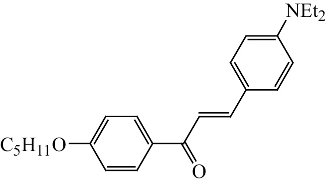 (E)-3-[4-(Диметиламино)фенил]-1-[4-(пентилокси)фенил]проп-2-ен-1-он (5). Выход 41%, т. пл. 127–129°С. ИК спектр, ν, см–1: 1644 (C=О). Спектр ЯМР 1H, δ, м. д. (J, Гц): 0.96 т (3H, CH3, J 7.1), 1.35–1.53 м (4H, CH2), 1.75–1.85 м (2H, CH2), 3.06 с (6H, NMe2), 4.03 т (2H, ОCH2, J 6.5), 6.71–6.76 м (2Н, C6H4NMe2), 6.91–6.96 м (2H, C6H4ОAm), 7.43 д (1Н, CH=CH, J 15.4), 7.54–7.59 м (2Н, C6H4NMe2), 7.61 д (1Н, CH=CH, J 15.4), 7.97–8.02 м (2Н, C6H4ОAm). Cпектр ЯМР 13С, δC, м. д.: 13.5 (CH3), 21.8 (CH2), 27.6 (CH2), 28.2 (CH2), 39.8 (NMe2), 67.3 (ОCН2), 111.8 (2CН), 113.5 (2CH), 116.4 (CH), 123.0, 129.7 (2CH), 129.9 (2CH), 130.9, 143.4 (CH), 150.9, 161.8, 186.3 (CО). Найдено, %: С 78.22; Н 8.03; N 4.10. C22H27NO2. Вычислено, %: С 78.30; Н 8.06; N 4.15.