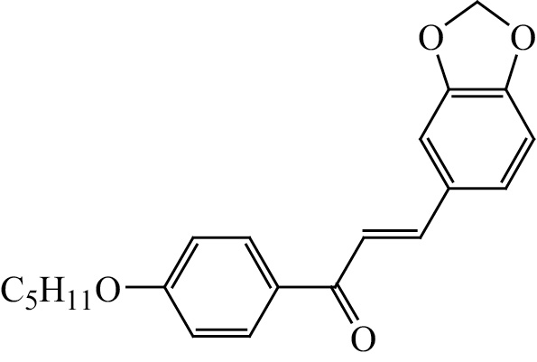 (E)-3-(Бензо[d][1, 3]диоксол-5-ил)-1-[4-(пентилокси)фенил]проп-2-ен-1-он (6). Выход 53%, т. пл. 99–100°С. ИК спектр, ν, см–1: 1649 (C=О). Спектр ЯМР 1H, δ, м. д. (J, Гц): 0.96 т (3H, CH3, J 7.1), 1.35–1.52 м (4H, CH2), 1.75–1.85 м (2H, CH2), 4.03 т (2H, ОCH2, J 6.5), 6.05 с (2H, ОCH2О), 6.84 д (1Н, C6H3, J 8.0), 6.91–6.96 м (2H, C6H4), 7.16 д. д (1Н, C6H3, J 8.0, 1.7), 7.39 д (1Н, C6H3, J 1.7), 7.58 с (2Н, CH=CH), 8.02–8.07 м (2Н, C6H4). Cпектр ЯМР 13С, δC, м. д.: 13.5 (CH3), 21.8 (CH2), 27.6 (CH2), 28.2 (CH2), 67.4 (ОCН2), 101.0 (ОCН2О), 106.4 (CH), 107.8 (CH), 113.6 (2CH), 119.6 (CH), 124.6 (CH), 129.2, 130.2 (2CH), 130.5, 142.5 (CH), 147.8, 148.9, 162.1, 186.2. Найдено, %: С 74.52; Н 6.45. C21H22O4. Вычислено, %: С 74.54; Н 6.55.