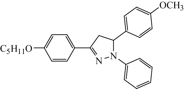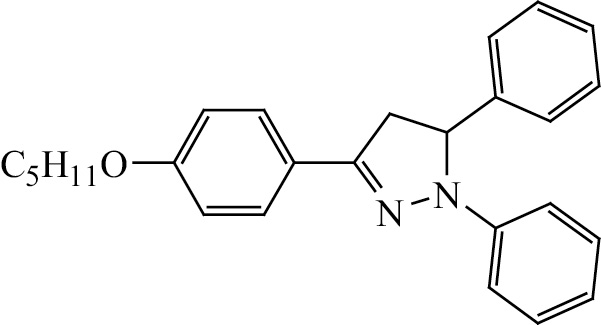 Общая методика получения пиразолинов 7–11. К раствору 0.001 моль (Е)-1-(4-пентилоксифенил)-3-(арил)проп-2-ен-1-она 2–6 и 0.001 моль фенилгидразина в 15 мл этанола при комнатной температуре добавляли 2 капли серной кислоты. Полученную смесь кипятили 5–7 ч и оставляли на ночь. Осадок отфильтровывали, промывали водой и перекристаллизовывали из этанола.