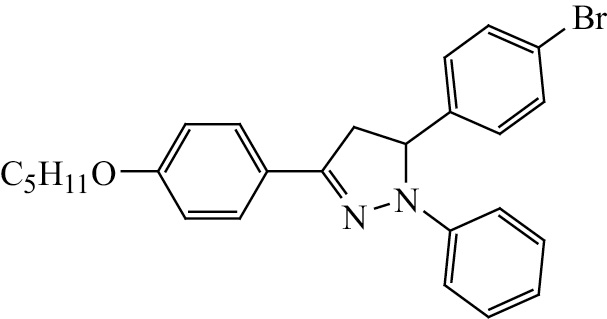 5-(4-Бромфенил)-3-[4-(пентилокси)фенил]-1-фенил-4,5-дигидро-1H-пиразол (9). Выход 95%, т. пл. 114–115°С. ИК спектр, ν, см–1: 1596 (C=N). Спектр ЯМР 1H, δ, м. д. (J, Гц): 0.95 т (3H, CH3, J 7.1), 1.34–1.52 м (4H, CH2), 1.72–1.82 м (2H, CH2), 3.02 д. д (1H, CH2, J 17.2, 7.0), 3.86 д. д (1Н, CH2, J 17.2, 12.2), 3.96 т (2H, ОCH2, J 6.4), 5.29 д. д (1Н, CH, J 12.2, 7.0), 6.64–6.70 м (1Н, p-C6H5), 6.83–6.88 м (2Н, C6H4ОC5H11), 6.91–6.95 м (2Н, o-C6H5), 7.05–7.11 м (2Н, m-C6H5), 7.22–7.26 м (2Н, C6H4Br), 7.42–7.46 м (2Н, C6H4Br), 7.57–7.62 м (2Н, C6H4ОC5H11). Cпектр ЯМР 13С, δC, м. д.: 13.5 (CH3), 21.8 (CH2), 27.6 (CH2), 28.3 (CH2), 43.0 (CН2CН), 62.7 (CН), 67.1 (ОCH2), 112.6 (2CH), 113.9 (2CH), 118.1, 120.3, 124.4, 126.7 (2CH), 127.4 (2CH), 128.1 (2CH), 131.4 (2CH), 141.6, 144.3, 146.2, 159.1. Найдено, %: C 67.30; H 5.80; N 6.03. C26H27BrN2O. Вычислено, %: C 67.39; H 5.87; N 6.05.