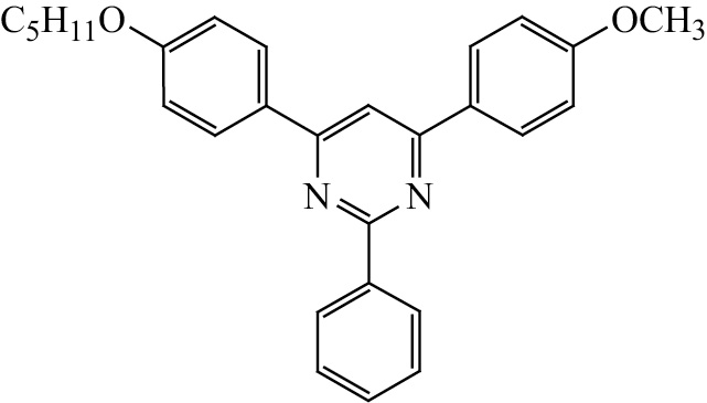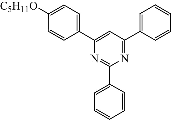 4-[4-(Пентилокси)фенил]-2,6-дифенилпиримидин (12). Выход 40%, т. пл. 89–90°С. ИК спектр, ν, см–1: 1606, 1589. Спектр ЯМР 1H, δ, м. д. (J, Гц): 0.98 т (3H, CH3, J 7.0), 1.37–1.55 м (4H, CH2), 1.77–1.87 м (2H, CH2), 4.04 т (2H, ОCH2, J 6.4), 6.98–7.04 м (2Н, C6H4), 7.45–7.58 м (6Н, Ar), 8.18 с (1Н, =CH), 8.32–8.40 м (4Н, Ar), 8.65–8.70 м (2Н, Ar). Cпектр ЯМР 13С, δC, м. д.: 13.6 (CH3), 21.8 (CH2), 27.6 (CH2), 28.3 (CH2), 67.2 (ОCН2), 108.8 (CH), 114.0 (2CH), 126.8 (2CH), 127.6 (2CH), 127.8 (2CH), 128.1 (2CH), 128.4 (2CH), 128.8, 129.8 (CH), 130.0 (CH), 136.9, 137.7, 160.9, 163.1, 163.4. Найдено, %: C 82.18; H 6.63; N 7.08. C27H26N2O. Вычислено, %: C 82.20; H 6.64; N 7.10.