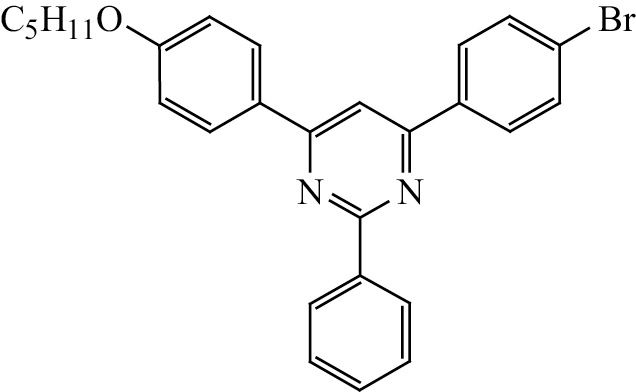 4-(4-Бромфенил)-6-[4-(пентилокси)фенил]-2-фенилпиримидин (14). Выход 40%, т. пл. 110–112°С. ИК спектр, ν, см–1: 1605, 1587. Спектр ЯМР 1H, δ, м. д. (J, Гц): 0.98 т (3H, CH3, J 7.1), 1.37–1.56 м (4H, CH2), 1.78–1.88 м (2H, CH2), 4.05 т (2H, ОCH2, J 6.4), 6.98–7.03 м (2Н, C6H4OAm), 7.44–7.54 м (3Н, m,p-C6H5), 7.65–7.70 м (2Н, C6H4Br), 8.24 с (1Н, =CH), 8.32–8.38 м (4Н, C6H4), 8.61–8.66 м (2Н, o-C6H5). Cпектр ЯМР 13С, δC, м. д.: 13.6 (CH3), 21.8 (CH2), 27.6 (CH2), 28.3 (CH2), 67.3 (ОCН2), 108.7 (CH), 114.0 (2CH), 124.3, 127.7 (2CH), 127.8 (2CH), 128.5 (2CH), 128.7 (2CH), 129.9 (CH), 131.2 (2CH), 136.0, 137.6, 161.0, 162.3, 163.2, 163.7. Найдено, %: C 68.45; H 5.30; N 5.90. C27H25BrN2O. Вычислено, %: C 68.50; H 5.32; N 5.92.