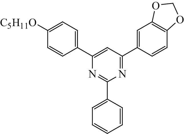 4-(Бензо[d][1, 3]диоксол-5-ил)-6-[4-(пентилокси)фенил]-2-фенилпиримидин (16). Выход 40%, т. пл. 105–107°С. ИК спектр, ν, см–1: 1607, 1589. Спектр ЯМР 1H, δ, м. д. (J, Гц): 0.98 т (3H, CH3, J 7.0), 1.37–1.55 м (4H, CH2), 1.82 уш. квинтет (2H, CH2, J 6.4), 4.04 т (2H, ОCH2, J 6.4), 6.09 с (2H, ОCH2О), 6.96 д (1Н, C6H3, J 8.2), 6.97–7.02 м (2Н, C6H4ОC5H11), 7.43–7.54 м (3Н, m,p-C6H5), 7.92–8.01 м (2Н, C6H3), 8.10 уш. с (1Н, =CH), 8.31–8.36 м (2Н, C6H4), 8.61–8.67 м (2Н, o-C6H5). Cпектр ЯМР 13С, δC, м. д.: 13.6 (CH3), 21.8 (CH2), 27.6 (CH2), 28.3 (CH2), 67.2 (ОCН2), 101.0 (ОCН2О), 107.0, 107.7 (CH), 108.1 (CH), 113.9 (2CH), 121.5 (CH), 127.6 (2CH), 127.7 (2CH), 128.4 (2CH), 128.9, 129.7 (CH), 131.1, 137.8, 147.8, 149.3, 160.8, 162.8, 162.9, 163.2. Найдено, %: C 76.58; H 5.95; N 6.37. C28H26N2O3. Вычислено, %: C 76.69; H 5.98; N 6.39.