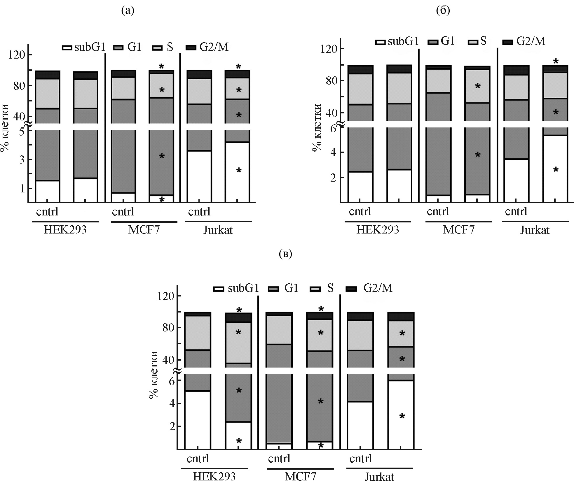 Рис. 1. Оценка влияния соединения 3 на прогрессию клеточного цикла клеток HEK293, MCF-7, и Jurkat. Клетки с тестируемым соединением в концентрации IC50, определенной для каждой клеточной линии, инкубировали в течение 24 (а), 48 (б), 72 ч (в). Данные, полученные в двух независимых экспериментах (N = 2, n = 6), представлены в виде среднего значения ± стандартное отклонение; * – р < 0.05 (t-критерий Уилкоксона).