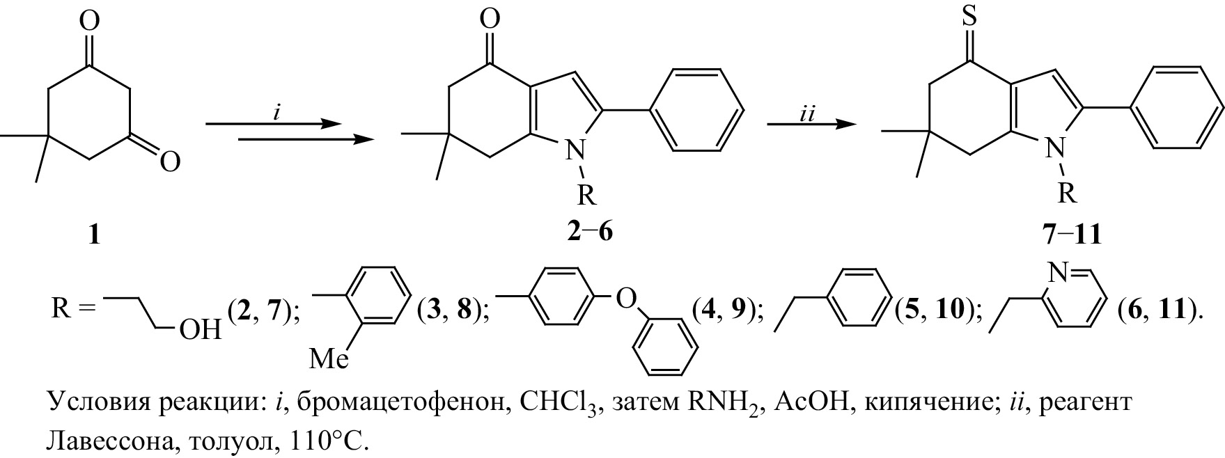 Синтез исходных тетрагидроиндолонов 2–6 (схема 1) осуществлен согласно литературным методикам [27, 32–34] реакцией димедона 1 с бромацетофеноном и далее с 3-хлор-, 2-метил-, 4-феноксианилинами и бензиламином. Следующую стадию, позволяющую получить тетрагидроиндолтионы 7–11, осуществляли кипячением индолонов 2–6 с эквимольным количеством реагента Лавессона согласно работе [35]; тионы 7–11 получены с выходами 91–96%.