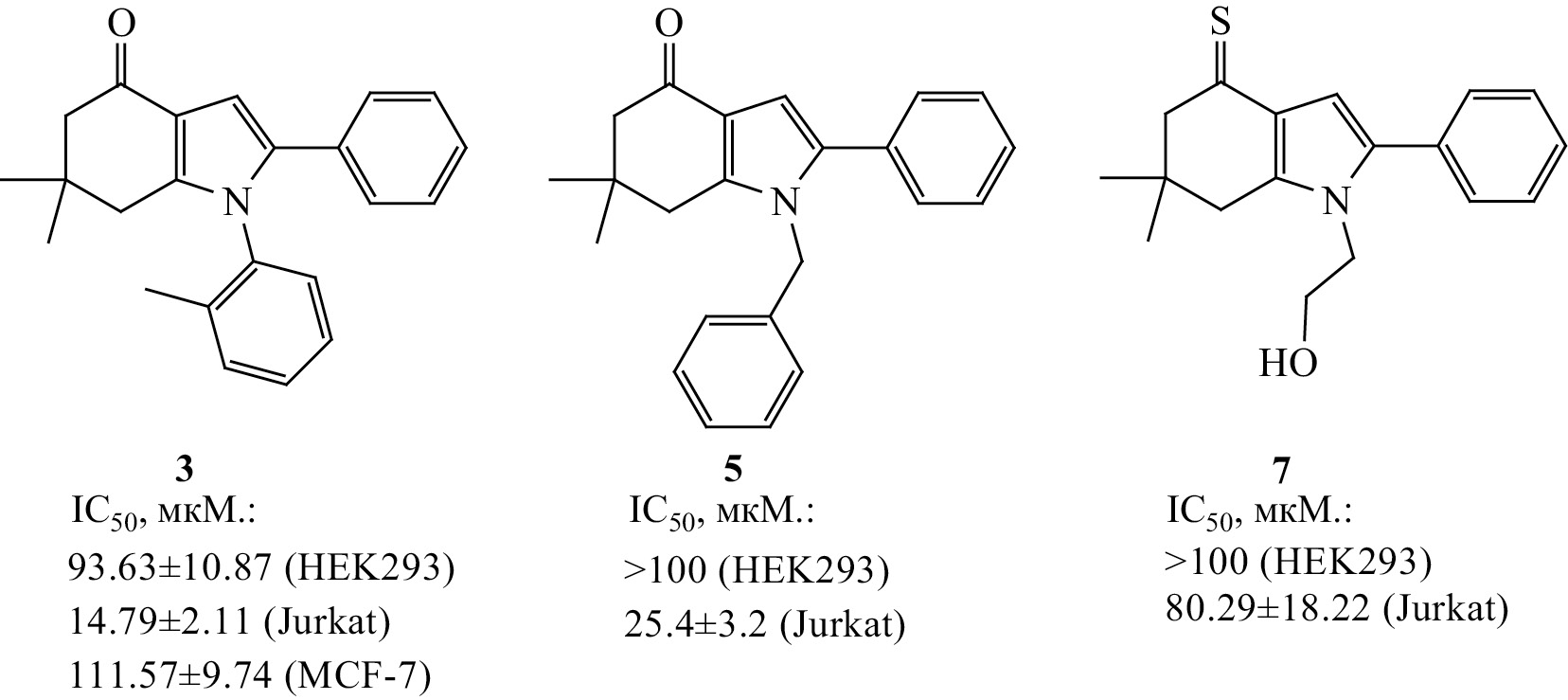 Таким образом, синтезирована серия новых производных тетрагидроиндол-4-она и их тиоаналогов. Проведена оценка цитотоксической активности полученных соединений в отношении клеточных линий HEK293, Jurkat и MCF-7, в результате которой обнаружено соединение-хит – 6,6-диметил-1-(2-метилфенил)-2-фенил-1,5,6,7-тетрагидро-4H-индол-4-он 3 – с цитотоксической активностью в отношении клеток линии Jurkat (IC50 = 14.79±2.11 мкM.) и клеток MCF-7 (IC50 = 111.57±9.74 мкM.). In silico показано, что механизм цитотоксического действия соединения 3, предположительно, может реализовываться за счет его взаимодействия с активным сайтом циклин-зависимой киназы CDK9 (PDB код – 3LQ5).