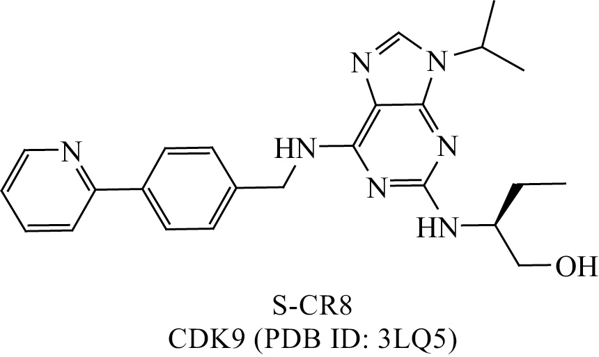 В дополнение к оценке цитотоксических свойств синтезированных соединений и с целью определения возможных молекулярных мишеней соединения-хита 3, связанных с его цитотоксическим действием (рис. 1), in silico была осуществлена процедура молекулярного докинга 3 в активные центры циклинзависимых киназ CDK2, CDK5 и CDK9 (PDB коды: 4GCJ, 3O0G, и 3LQ5 [28–31]. В качестве оценочных критериев использовали рассчитанные значения DGbind (энергия связывания лиганда и белка в лиганд-белковый комплекс), а также количество совпадающих для соединения 3 и референсных лигандов взаимодействий с аминокислотами. Согласно результатам выполненных расчетов (табл. 2) значения ∆Gbind соединения 3 и референсного лиганда S-CR8 (схема 3) оказались наиболее близки в случае CDK9 (–58.84 и –59.64 ккал/моль соответственно).