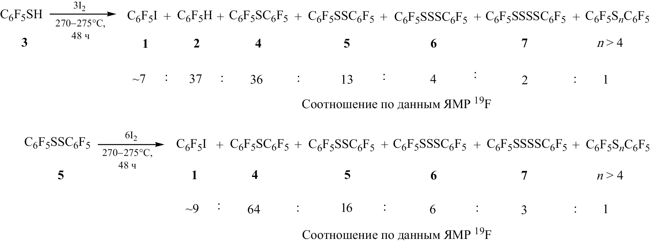 Реакции пентафторбензолтиола 3 и декафтордифенилдисульфана 5 с I2. В металлическом кожухе нагревали запаянную ампулу со смесью тиола 3 (0.111 г, 0.56 ммоль) и I2 (0.437 г, 1.72 ммоль) при 270–275°C в течение 48 ч. По окончании выдержки ампулу охлаждали, вскрывали, содержимое экстрагировали ~2 мл CHCl3. Согласно данным ЯМР 19F, смесь содержала соединения 1, 2, 4–7 и предполагаемые полисульфаны (С6F5SnС6F5, n > 4) в соотношении ~7:37:36:13:4:2:1 соответственно. Аналогично из дисульфана 5 (0.091 г, 0.23 ммоль) и I2 (0.364 г, 1.43 ммоль) получили смесь, содержащую соединения 1, 4–7 и предполагаемые полисульфаны (С6F5SnС6F5, n > 4) в соотношении ~9:64:16:6:3:1 соответственно.