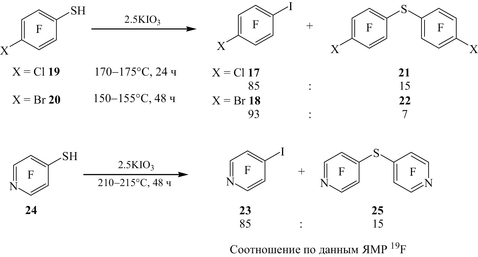 Следует отметить, что образование 1-иод-2,3,5,6-тетрафтор-4-хлорбензолa 17 и 1-бром-4-иод-2,3,5,6-тетрафторбензолa 18 из 4-хлор-2,3,5,6-тетрафторбензолтиола 19 и 4-бром-2,3,5,6-тетрафторбензолтиола 20 с KIO3, происходит при более низких температурах (схема 6), чем в аналогичных реакциях соединений 3, 9 и 10. При этом также получаются 2,2′,3,3′,5,5′,6,6′-октафтор-4,4′-дихлордифенилсульфан 21 и 4,4′-дибром-2,2′,3,3′,5,5′,6,6′-октафтордифенилсульфан 22. С целью распространения данной реакции на пентафторпиридин осуществлен синтез 4-иод-2,3,5,6-тетрафторпиридина 23 из 4-тиол-2,3,5,6-тетрафторпиридина 24 и KIO3 (схема 6). В реакции также образуется и (2,2′,3,3′,5,5′,6,6′-октафтордипирид-4,4′-ил)сульфан 25 (схема 6).