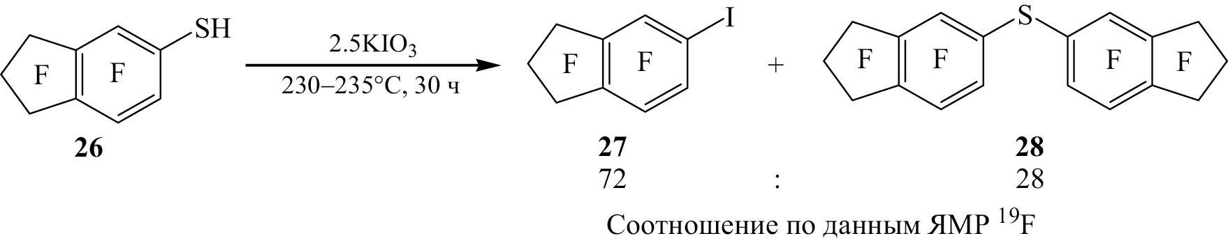 При нагревании нонафториндан-5-тиола 26 с KIO3 были получены 5-иоднонафториндан 27 и бис(нонафториндан-5-ил)сульфан 28 (схема 7).