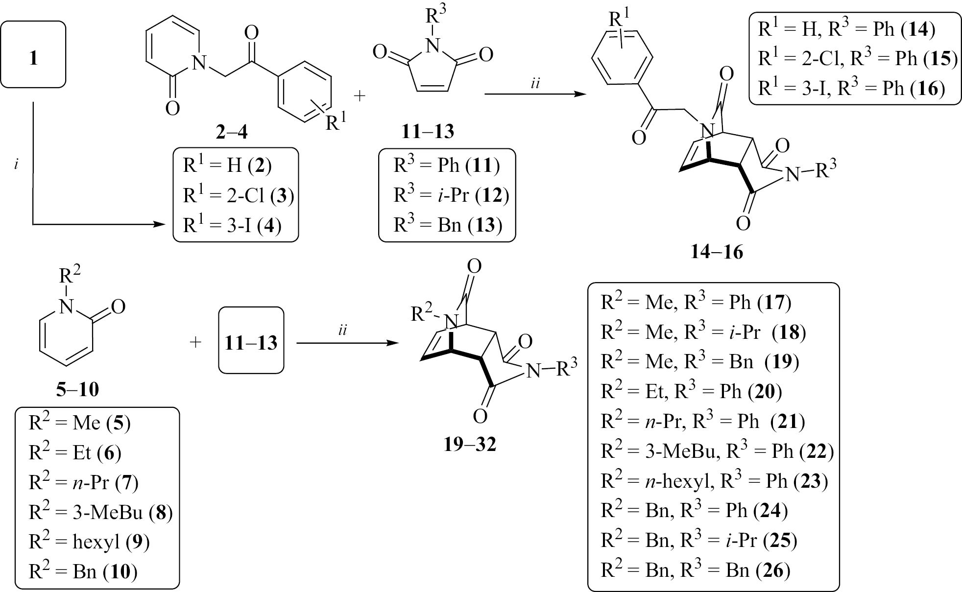 В качестве исходных соединений использовали коммерчески доступные алкилированные производные 2-пиридона 2, 3, 5–10 и N-фенил-, N-изопропил- и N-бензилзамещенные имиды малеиновой кислоты 11–13 (схема 2). Синтез иодпроизводного 4 осуществляли путем алкилирования 1 2-бром-1-(3-иодфенил)этан-1-оном в условиях, указанных на схеме 2. Реакцию Дильса–Альдера диенов 2–10 с диенофилами 11–13 (мольное соотношение 1:5) проводили путем кипячения исходных соединений в толуоле. Контроль за ходом реакции осуществляли методом ТСХ. Продукты 14–26 реакции выделяли методом колоночной хроматографии на SiO2. Выходы новых аддуктов 14–16 и 20–23 составили 68–97%. Соединения 17–19 и 24–26 описаны нами ранее [23], строение новых аддуктов 14–16 и 20–23 (во всех случаях также было зафиксировано образование только эндо-аддуктов) устанавливали по аналогии с работой [23] на основании данных спектроскопии ЯМР и литературных данных [24].