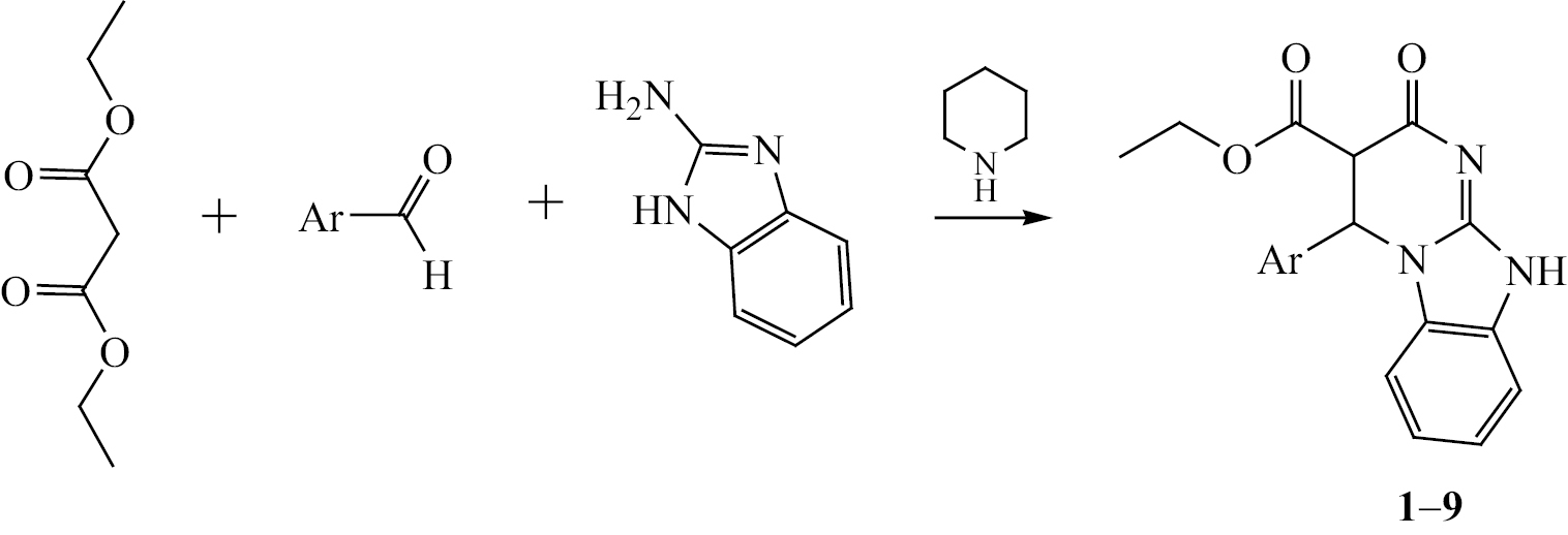 В настоящей работе изучена трехкомнонентная реакция диэтилмалоната, ароматического альдегида, 2-аминобензимидазола при кипячении в этаноле в течение 4 ч в присутствии пиперидина в качестве основания. Проведенные исследования позволили установить, что единственными продуктами в данных условиях являются этил-4-арил-2-оксо-2,3,4,10-тетрагидробензо[4, 5]имидазо[1,2-a]пиримидин-3-карбоксилаты 1–9 (схема 1).