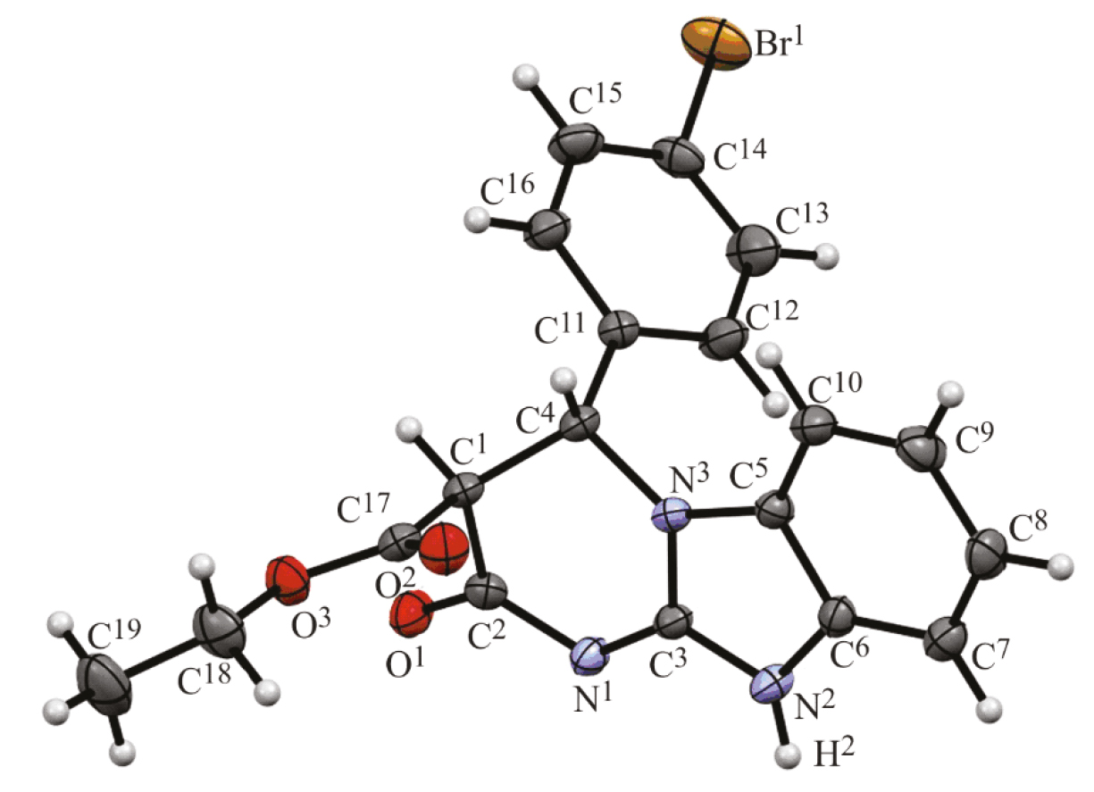 Этил-4-(4-бромфенил)-2-оксо-2,3,4,10-тетрагидробензо[4, 5]имидазо[1,2-а]пиримидин-3-карбоксилат (1). Смесь 1.5 мл (0.01 моль) диэтилмалоната, 1.84 г (0.01 моль) 4-бромбензальдегида, 1.33 г (0.01 моль) 2-аминобензимидазола в 10 мл этанола в присутствии 1 мл (0.01 моль) пиперидина кипятили 4 ч. Осадок отфильтровывали, промывали горячим этанолом и сушили. Выход 3.22 г (78%), т. пл. 245–247°С. Спектр ЯМР 1Н, δ, м. д.: 1.08 т (3Н, CH3CH2OCO, J 8.0 Гц), 4.12 к (2Н, CH3CH2OCO, J 8.0 Гц), 4.32 д (1Н, С3H, J 4.0 Гц), 6.15 д (1Н, С4H, J 4.0 Гц), 6.90 д (1Н, С6H, J 8.0 Гц), 7.02 т (1Н, С7H, J 8.0 Гц), 7.13 т (1Н, С8H, J 8.0 Гц), 7.18 д (2Н, ArH, J 8.7 Гц), 7.48 д (1Н, С9H, J 8.0 Гц), 7.62 д (2Н, ArH, J 8.7 Гц), 12.03 c (1Н, NH). Спектр ЯМР 13С, δС, м. д.: 14.3, 55.2, 55.3, 62.2, 110.1, 117.9, 121.8, 122.5, 122.6, 129.2, 129.8, 132.5, 132.6, 132.7, 136.6, 141.6, 148.0, 164.2, 166.9. Найдено, %: C 54.85; H 3.96; N 9.92. C19H16BrN3O3. Вычислено, %: C 55.09; H 3.89; N 10.14.