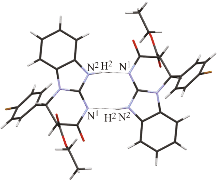 Соединение 1 кристаллизуется в центросимметричной пространственной группе моноклинной сингонии в виде рацемата (рис. 1). Кристаллы состоят из молекул одного диастереомера с транс-расположением этоксикарбонильного и арильного заместителей. Бензимидазольный фрагмент плоский. Пиримидиновый цикл находится в конформации искаженная ванна с выходом атомов C1 и С2 из плоскости N1C3N3C4 на 0.70 и 0.27 Å. Атом водорода H2 уточнен в качестве связанного с атомом N2, так как возле атома N2 больше остаточной электронной плотности и при таком расположении H2 получены меньшие факторы расходимости. Распределение длин связей N2–C3 [1.321(5) Å] и N1=C3 [1.341(4) Å], напротив, свидетельствуют о расположении атома водорода у атома азота N1. Такая неоднозначность, вероятно, возникает вследствие существования в кристалле обоих таутомеров или наличия водородных связей N2–H2∙∙∙N1, за счет которых молекулы в кристалле связаны в центросимметричные димеры (рис. 2).