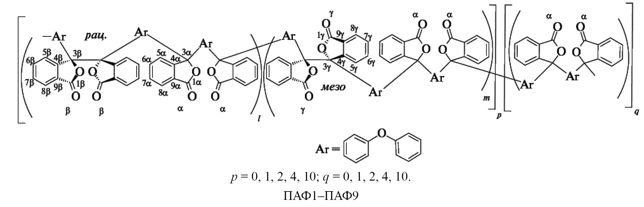 Макроцепи данных сополимеров построены из p- и/или q-звеньев: в состав p-звеньев входят как одиночные (α), так и дифталидные группы хиральной (β) и мезо- (γ) конфигураций, а q-звенья макромолекул содержат только α-фталидные группы.