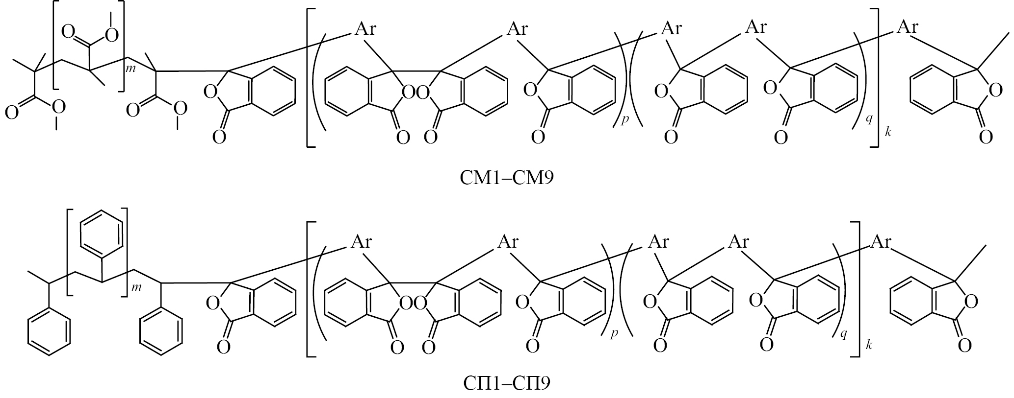 По схеме, аналогичной с синтезом ариленфталидстирольных сополимеров (СП) [31], на основе полиариленфталидов ПАФ1–ПАФ9 и метилметакрилата получены сополимеры СМ1–СМ9, в макроцепях которых полиметилметакрилатные блоки чередуются с фрагментами полиариленфталидов ПАФ1–ПАФ9 (табл. 1, схема 2).