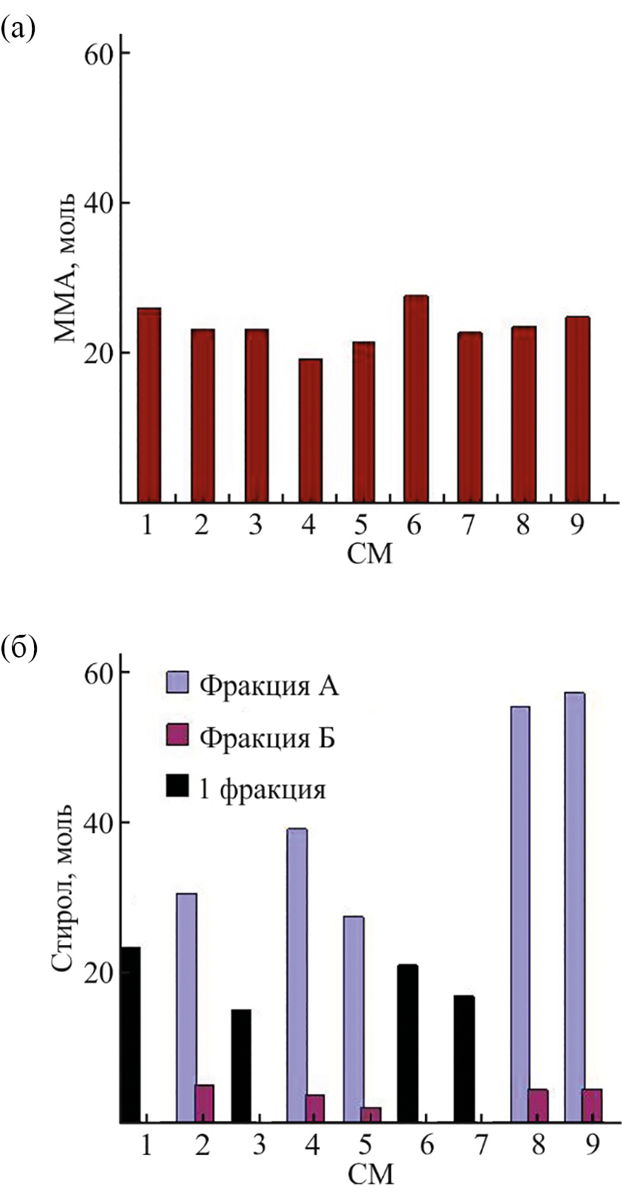 Согласно результатам фотометрического исследования, в макромолекулярном звене сополимера с метилметакрилатом на 1 моль фталидного звена приходится ~20–26 моль звеньев метилметакрилата (рис. 7а). В случае сополимеров со стиролом аналогичный состав имеют лишь сополимеры, которые, как и в реакциях с метилметакрилатом, формируются в гомофазных условиях: на один моль фталидного звена приходится ~15–21 моль стирольных звеньев (рис. 7б).