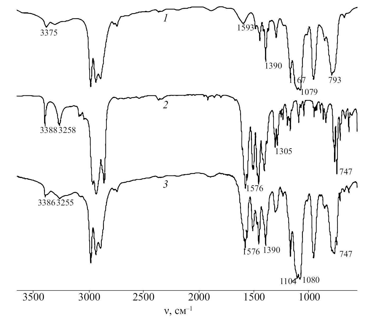 Рис. 4. ИК спектры APTES (1), диклофенака натрия (2) и их смеси (3).
