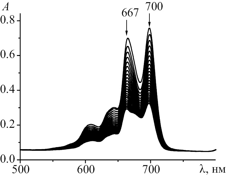 Предварительно установлено, что в малополярном бензоле и среде бензол–диметилсульфоксид с содержанием полярного компонента от 5 до 40% электронный спектр поглощения H2Pc(I)4(t-Bu)4 содержит в видимой области две интенсивные хорошо разрешенные Qх- и Qy-составляющие Q-полосы с λI = 700 и λII = 667 нм соответственно и В-полосу (полосу Соре) с λ = 347 нм (рис. 1). В присутствии н-бутиламина электронный спектр поглощения H2Pc(I)4(t-Bu)4 в среде бензол–5(10)% ДМСО подвергается существенным изменениям в отличие от бензола. С течением времени регистрируется уменьшение интенсивности Qх- и Qy-составляющих Q-полосы с λI и λII соответственно (рис. 2, 3). При этом исчезает В-полоса, характеризующая наличие пиррольных фрагментов в макроцикле (рис. 3), а цвет раствора изменяется от изумрудного до бесцветного.