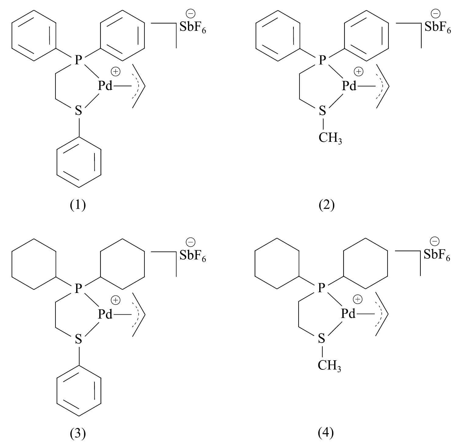 Для установления влияния структуры фосфин-тиоэфирных лигандов на активность катализаторов в аддитивной полимеризации норборнена были синтезированы комплексы палладия двух типов. Один из подходов к дизайну эффективных катализаторов полимеризации основывается на получении однокомпонентных катионных комплексов палладия, содержащих в своей структуре лабильный лиганд и слабокоординирующийся анион [11]. В данной работе синтезирована серия катионных аллильных комплексов палладия (1)–(4) с хелатной координацией атомов фосфора и серы к атому переходного металла. Строение полученных комплексов исследовано с использованием 1H и 31P ЯМР-спектроскопии. Свидетельством хелатной координации атомов фосфора и серы к атому палладия является смещение соответствующих сигналов протонов в 1H ЯМР-спектрах комплексов в слабое поле по сравнению со спектром исходного лиганда [12].