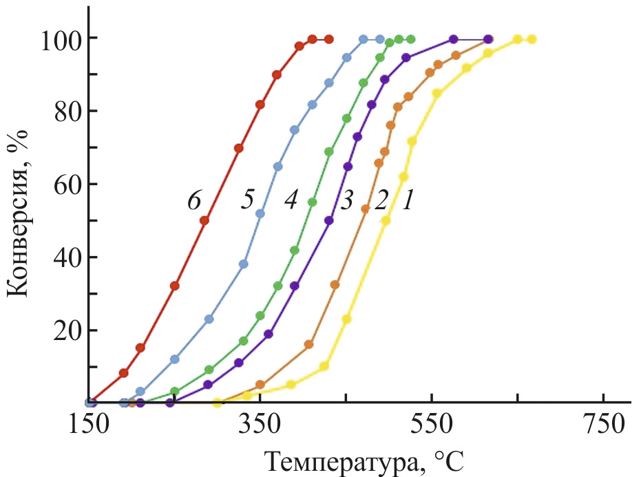 Каталитическую активность синтезированных материалов в реакции полного окисления метана определяли проточным методом. Навеску катализатора массой 1 г смешивали с кварцем для предотвращения локального перегрева и помещали в U-образный кварцевый реактор, затем через реактор пропускали газовую смесь и производили нагрев до необходимой температуры. Тестирование катализаторов в реакции полной конверсии метана исследовали на модельной смеси: СН4 — 1 об%, О2 — 8 об%, N2 — баланс (ОАО «Линде Газ Рус») — при скорости подачи газовой смеси 60 мл·мин–1 в интервале температур 20–700°С. Концентрацию компонентов газовой смеси (О2, N2, CO, CH4, CO2 и Н2О) определяли методом газовой хроматографии на приборе CHROM-5 (CHROM). Для разделения использовали колонки с молекулярными ситами NaХ (l = 2.5 м, d = 3 мм) и ParoPak Q (l = 5 м, d = 2 мм). Регистрацию сигнала проводили с помощью детектора по теплопроводности. Обработку хроматограмм проводили с применением программного обеспечения «Экохром».