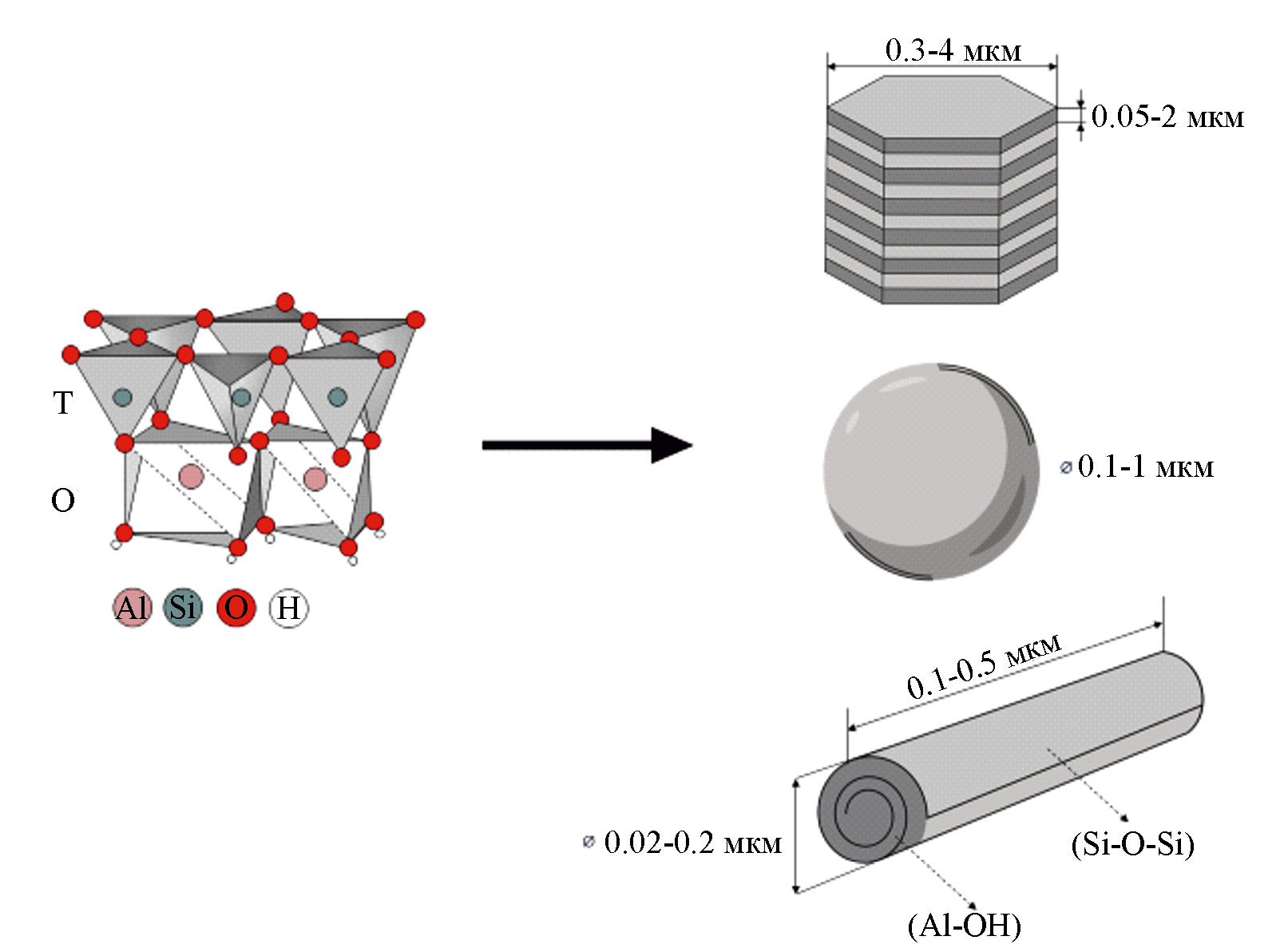 Рис. 2. Схематическое изображение формирования различных морфологий алюмосиликатов подгруппы каолинита.