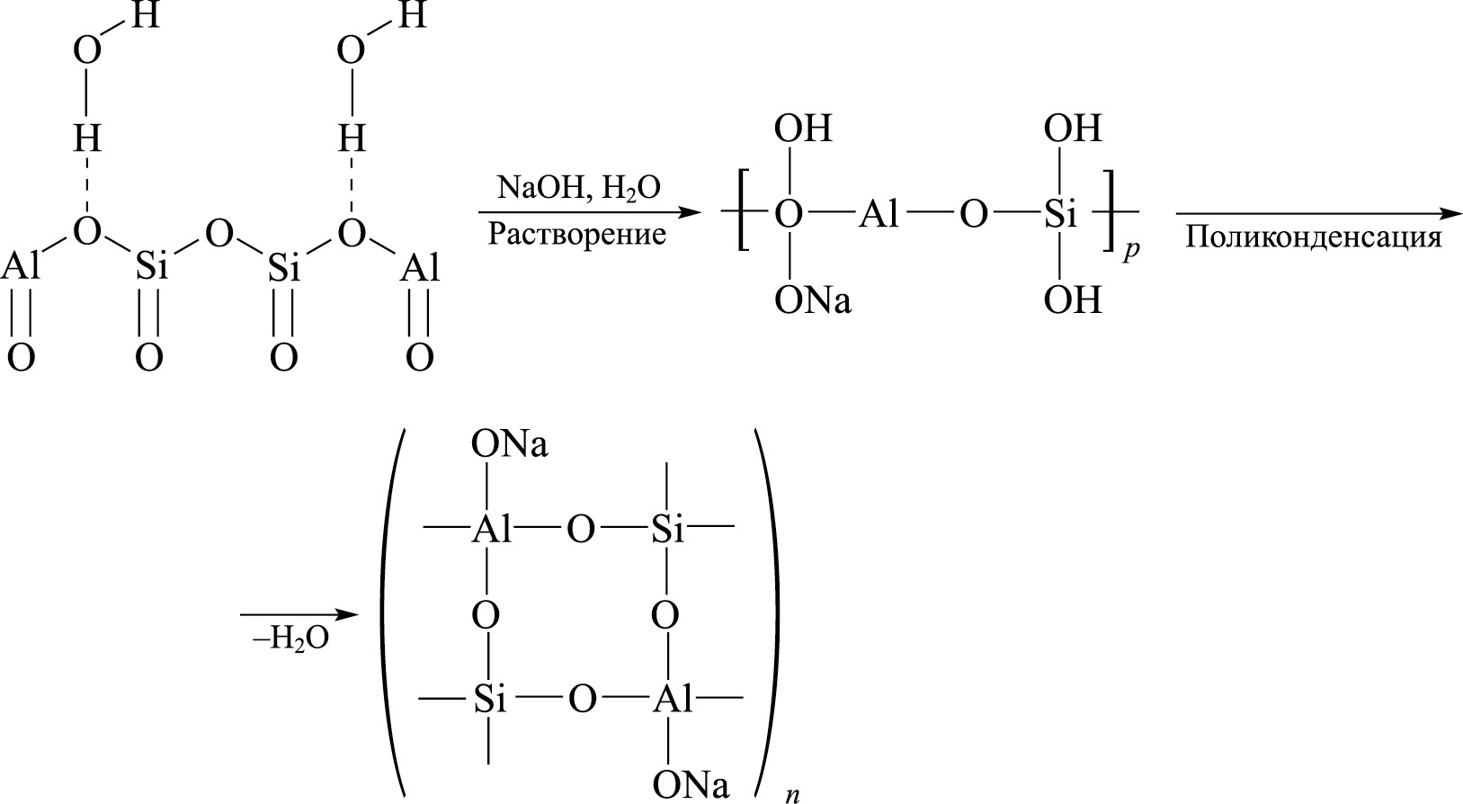 На сегодняшний день исследователи сходятся во мнении, что процесс геополимеризации представляет собой совокупность последовательных стадий. На первой стадии происходит частичное растворение алюмосиликатного прекурсора. В результате разрыва связей Si—O—Si и Si—O—Al образуются силикатные и алюминатные мономеры, которые вступают в реакцию с образованием олигомеров [53, 54]. В момент достижения равновесного состояния раствор становится пересыщенным олигомерами, которые в свою очередь поликонденсируются в гель. Постепенно фрагменты полисиалатной сети конденсируются и теряют подвижность. Продолжительность стадий растворения и поликонденсации можно установить по изменению реологических характеристик геополимерной пасты [55]. При растворении алюмосиликатного прекурсора наблюдается незначительное изменение реологических параметров, что объясняется малым изменением структуры системы. На этапе геополиконденсации отмечается резкий рост значений эффективной вязкости и касательных напряжений сдвига раствора, что говорит об образовании в системе полимерной сети. После формирования крупных фрагментов геополимерной сети начинается их взаимная поликонденсация с образованием поверхности раздела фаз [56]. При протекании процесса геополиконденсации вода ведет себя как реакционноспособная среда, которая расходуется на стадии растворения и гидролиза и выделяется на стадии поликонденсации.