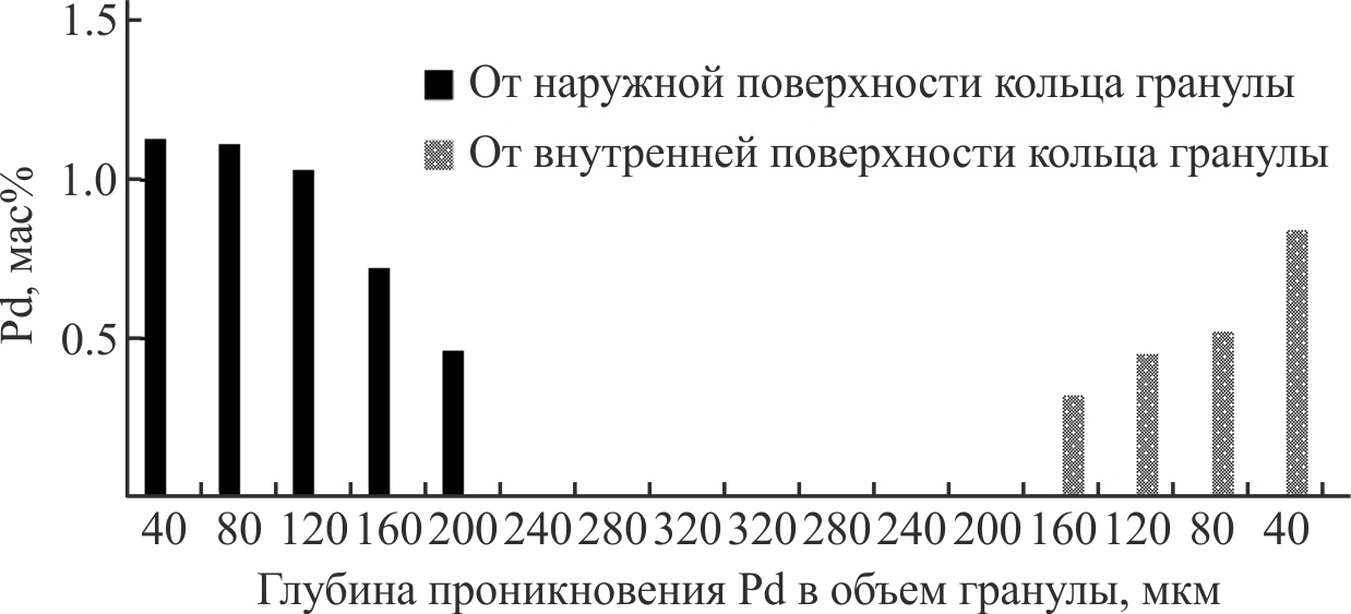 На качественном уровне соизмеримые значения глубины проникновения Pd в объем гранулы катализатора 160–200 мкм получены по результатам локального энергодисперсионного спектрометрического анализа (рис. 4). Количественно независимо от глубины проникновения каталитически активного компонента со стороны наружной и внутренней поверхности кольца гранулы концентрация Pd в приповерхностной области гранулы в ~3 раза выше, чем на границе его проникновения в объем гранулы.