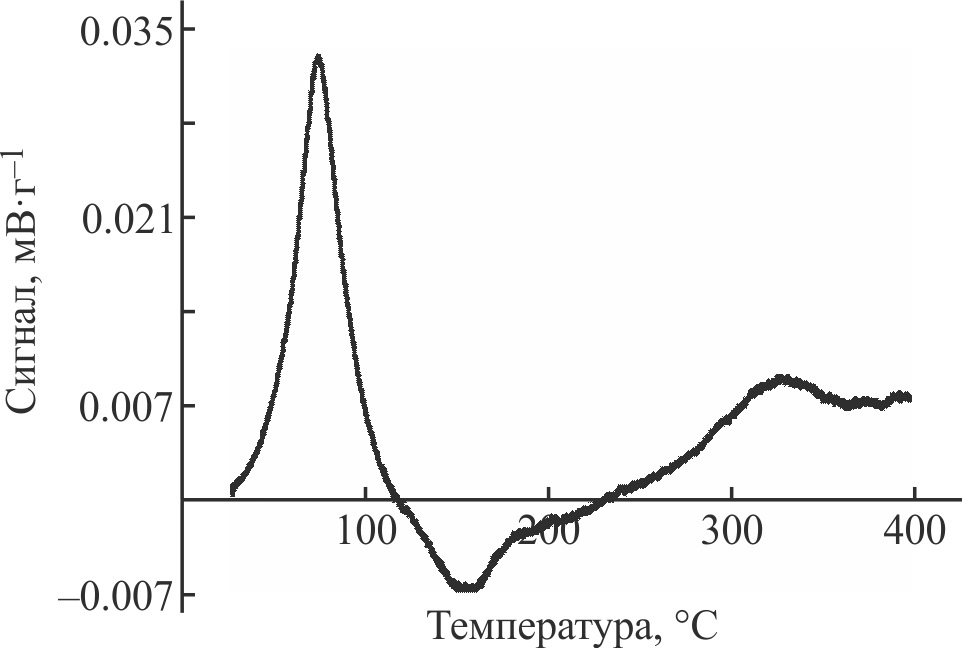 Первый узкий пик с высокой интенсивностью в области температур 50–100°С (рис. 5) характерен для восстановления частиц PdO [14]. Наличие обратного пика десорбции H2 (область температур ~154°С) связывают с разрушением гидридной фазы в структуре крупных частиц Pd (более 35 нм) [15]. Широкий сигнал поглощения с низкой интенсивностью в интервале температур 300–350°С может свидетельствовать либо о прочносвязанных с поверхностью носителя катионов Pd(II), либо о наличии на поверхности носителя моноядерного комплекса Pd(CH3COO)2 [16]. Исходя из того что, по данным термопрограммируемого восстановления водородом, PdO, образующийся при разложении Pd(CH3COO)2, легко восстанавливается в температурном интервале ~50–100°С, для активации катализатора была выбрана температура 100°С.