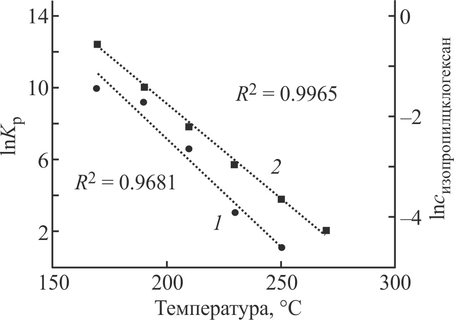 По виду температурных зависимостей расчетной константы равновесия (Kp) н-пропилциклогексана и концентрации (с) изопропилциклогексана можно полагать, что снижение выхода циклоалкана с ростом температуры связано с достижением положения равновесия (рис. 6).