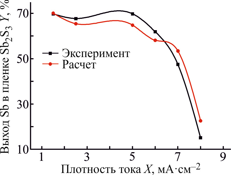 где X1 — плотность тока (мA·cм–2), X2 и Х3 — исходные концентрации SbOCl и Na2SO3 соответственно, Y — конечное количество Sb2S3 (%).