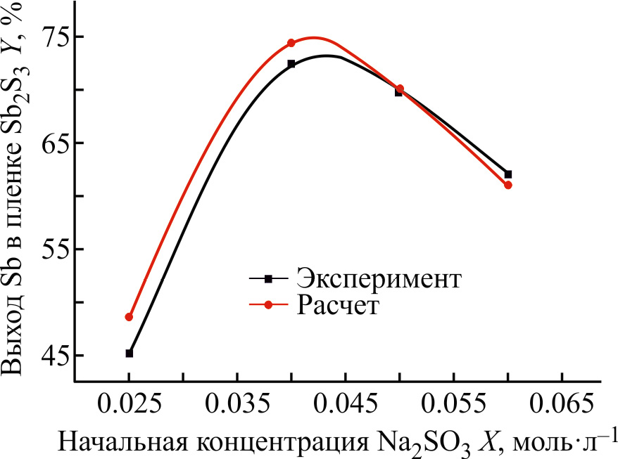 Рис. 3 показывает, что максимальному выходу Sb в пленке соответствует исходная концентрация Na2SO3 0.042 моль·л–1.