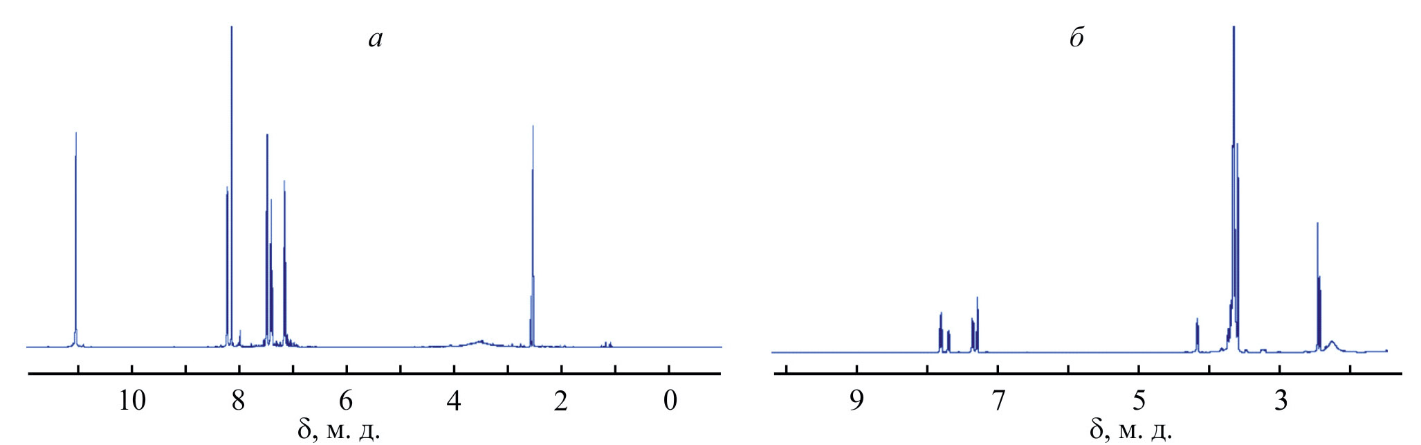 Рис. 1. 1Н ЯМР-спектры индоло[3,2-b]карбазола в дейтерированном диметилсульфоксиде (а) и тозилированного полиэтиленгликоля с молекулярной массой 1000 в дейтерированном хлороформе (б).