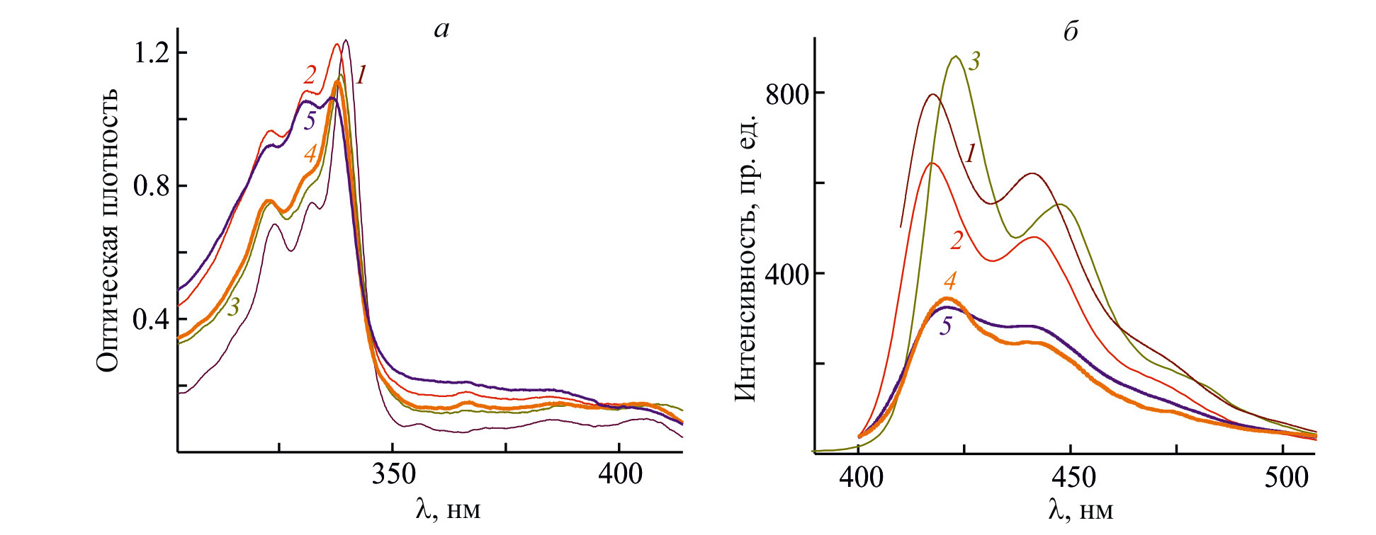 Рис. 3. Спектры поглощения (а) и фотолюминесценции (б) растворов индоло[3, 2-b]карбазола (1), индоло[3, 2-b]карбазол-полиэтиленгликоля 400 (2), индоло[3, 2-b]карбазол-полиэтиленгликоля 1000 (3), индоло[3, 2-b]карбазол-полиэтиленгликоля 2000 (4) и индоло[3, 2-b]карбазол-полиэтиленгликоля 3000 (5) в N-метилпирролидоне.