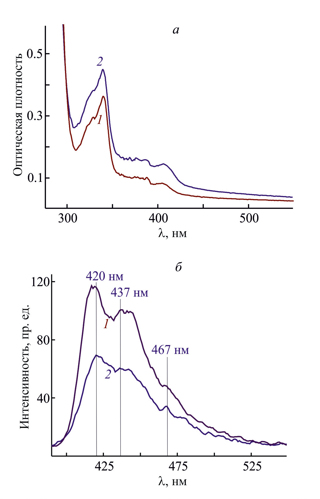 Рис. 4. Спектры поглощения (а) и люминесценции (б) композитных покрытий на стекле: полимерная матрица + 20 мас% индоло[3,2-b]карбазол-полиэтиленгликоля 3000 (1) и полимерная матрица + 50 мас% индоло[3,2-b]карбазол-полиэтиленгликоля 3000 (2).