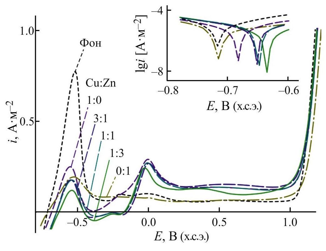 Для всех изученных значений соотношения Cu:Zn введение комплексов в коррозионную среду в концентрации сinh от 0.1 до 1.0 ммоль·дм–3 снижает критическую плотность тока iC, отвечающую началу пассивации металла, что свидетельствует об облегчении начала формирования пассивной пленки, а также повышается потенциал разомкнутой цепи (рис. 1). Снижение критической плотности тока наиболее выражено при соотношении Cu:Zn = 1:3. В интервале E = –0.5÷–0.15 В (х.с.э.) наблюдается также изменение направления тока электрода с анодного на катодное, описанное в литературе как катодная петля пассивации. 1 Этот феномен свидетельствует о том, что в этом интервале потенциалов крутизна вольт-амперной характеристики для катодного процесса выше, чем для анодного, что может вести к самопроизвольной пассивации поверхности стали. Для значений концентрации сinh 0.5 ммоль·дм–3 и более при E = –0.15÷0.05 В (х.с.э.) наблюдается пик плотности тока анодного растворения металла, а при более высоких потенциалах (в условно пассивной области) наблюдается повышение плотности тока анодного растворения металла.