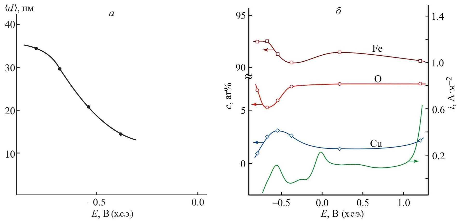 Рис. 5. Зависимости среднего размера частиц меди на поверхности образца ⟨d⟩ (а), атомных долей c Fe, O и Cu в составе поверхностного слоя (около 1 мкм) образца и анодного тока i (б) от потенциала образца E в присутствии 1.0 ммоль·дм–3 ингибитора Na4[(Cu,Zn)N(CH2PO3)3]·13H2O с соотношением Cu:Zn = 1:3.