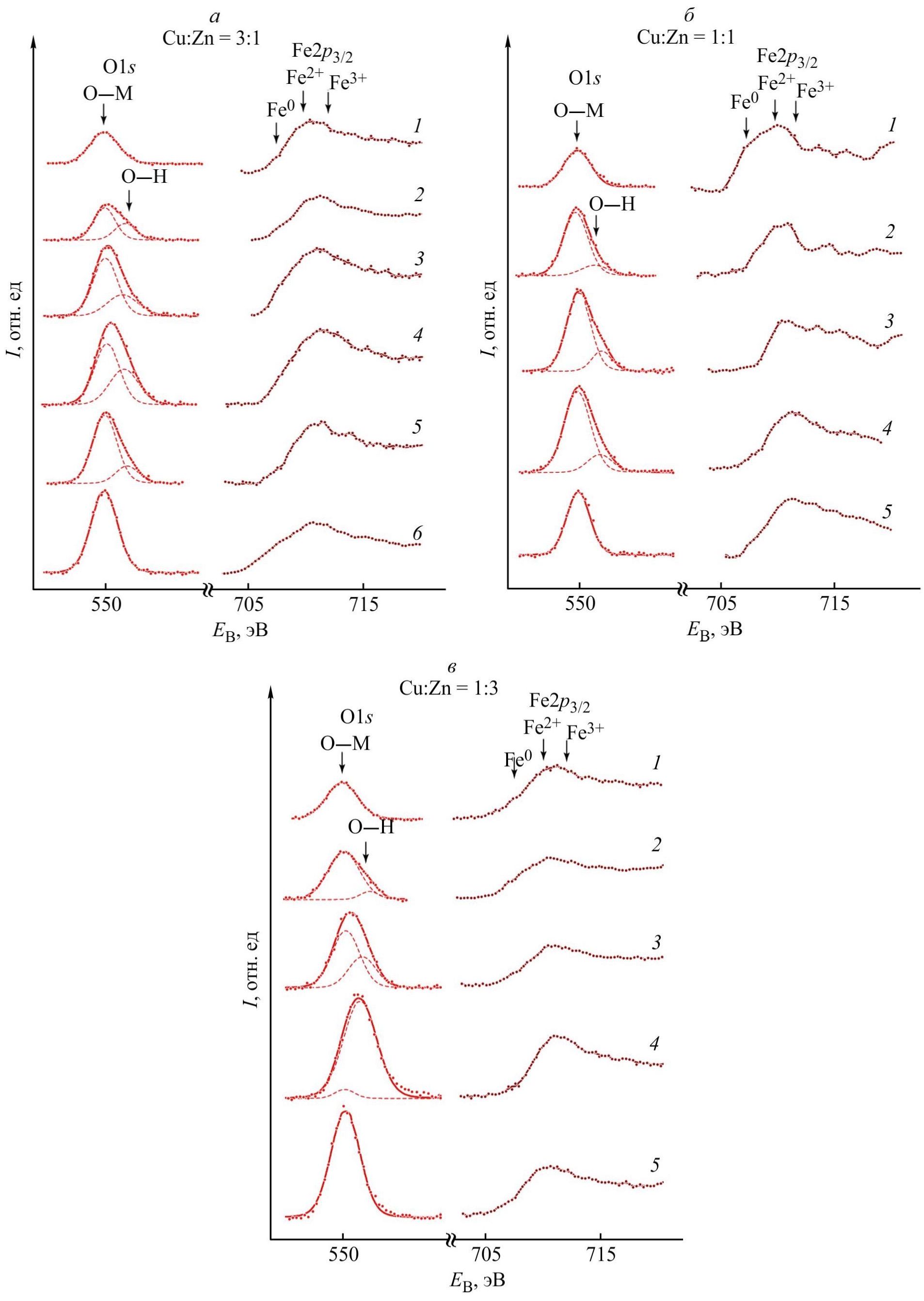 Рис. 7. Рентгеновские фотоэлектронные спектры в интервалах энергии связи EB, соответствующих спектрам O1s- и Fe2p-фотоэлектронов, полученные с поверхности образцов, поляризованных в коррозионной среде с добавками 1.0 ммоль·дм–3 комплексов Na4[(Cu,Zn)N(CH2PO3)3]·13H2O при Cu:Zn = 3:1 (а) [потенциал образца E = –0.80 (1), –0.66 (2), –0.55 (3), –0.35 (4), +0.20 (5), +1.20 В (х.с.э.) (6)]; Cu:Zn = 1:1 (б) и Cu:Zn = 1:3 (в) [потенциал образца E = –0.66 (1), –0.55 (2), –0.35 (3), +0.20 (4), +1.20 В (х.с.э.) (5)].