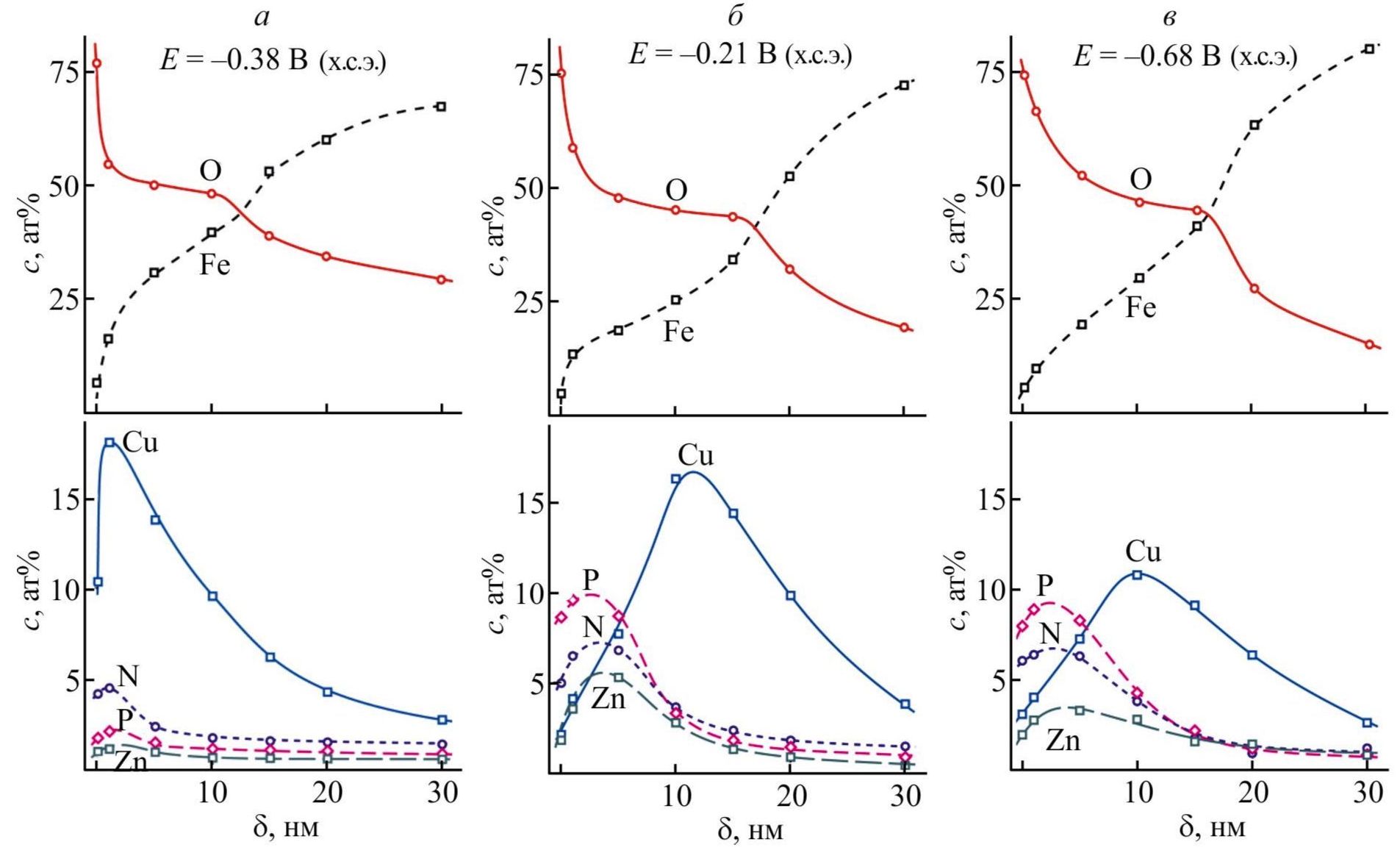 В области катодной петли пассивации [–0.35 В (х.с.э.)] заметное количество компонентов ингибитора (и Cu) присутствует только в тонком (0–10 нм) поверхностном слое металла (рис. 9). Метод послойного травления не позволяет определить окислительное состояние большинства элементов, 5 так как их соединения разрушаются при бомбардировке ионами Ar+. Однако сопоставление со спектрами поверхностного слоя на рис. 6, в, 7, в и 8, в (кривые 3) показывает, что железо в поверхностном слое присутствует как в состоянии Fe0, так и в оксидах и гидроксидах в состояниях Fe2+ и Fe3+, медь представлена состояниями как Cu0, так и Cu2+, а фосфор присутствует как в исходном комплексе, так и в продукте его реакции с ионами Fe2+ — комплексе [Zn1/2Fe1/2(H2O)3NH(CH2PO3H)3] [1]. С повышением потенциала образца до +0.21 В (х.с.э.) максимум содержания меди смещается в область глубины 5–15 нм; при этом на поверхности содержание меди резко убывает (ср. с кривой 4 на рис. 6, в). Напротив, N, P и Zn присутствуют преимущественно в поверхностном слое (0–10 нм), формируя защитный слой, а содержание Fe в этом слое снижается. При потенциале +0.68 В (х.с.э.), который соответствует наименьшей плотности тока анодного растворения металла в пассивной области при концентрации ингибитора 1.0 ммоль·дм–3 (рис. 1, в), общая структура поверхностного слоя сохраняется. Содержание меди снижается, а в поверхностном слое присутствуют N, P и Zn — компоненты комплекса [Zn1/2Fe1/2(H2O)3NH(CH2PO3H)3]. Резкое падение концентрации кислорода на глубине 16–18 нм свидетельствует о плотности и непроницаемости пассивной пленки, сформированной на поверхности стали.