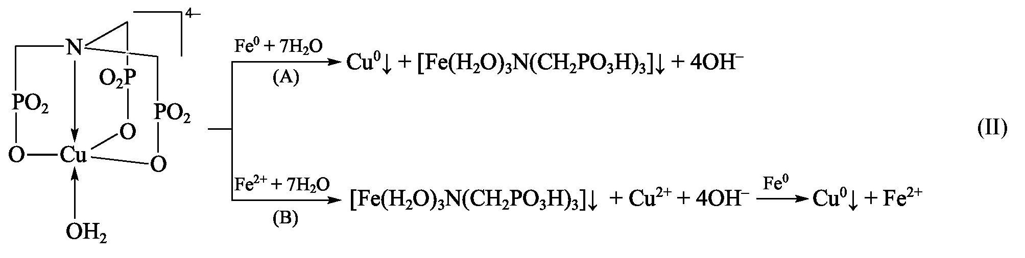 Выделение металлической меди на поверхности стали при обменной реакции железа с ионом [CuN(CH2PO3)3]4– может протекать по двум каналам (II):