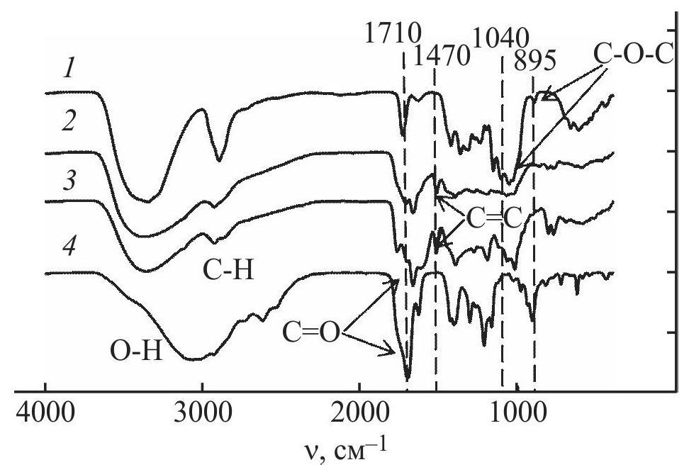 1 — нативная наноцеллюлоза, 2 — углеродные точки из нативной наноцеллюлозы, 3 — углеродные точки из сульфатированной наноцеллюлозы, 4 — углеродные точки из лимонной кислоты.