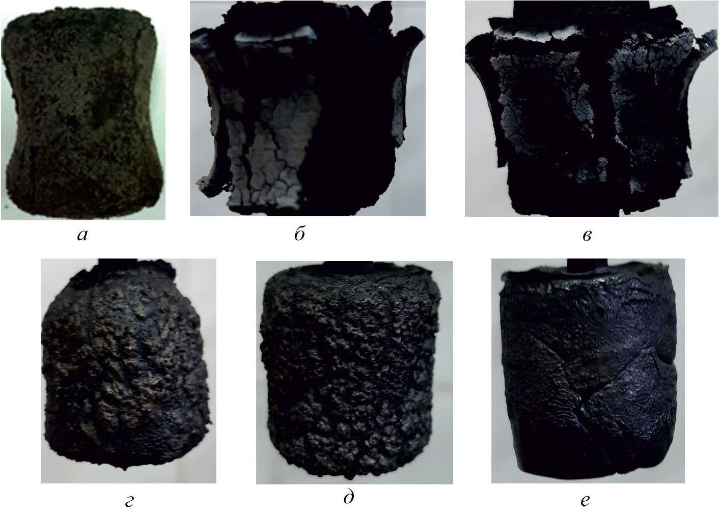 Рис. 5. Образец на основе этиленпропиленового каучука (а–в) и бутадиен-нитрильного каучука (г–е) после испытаний на стойкость коксового слоя к эрозионному уносу.