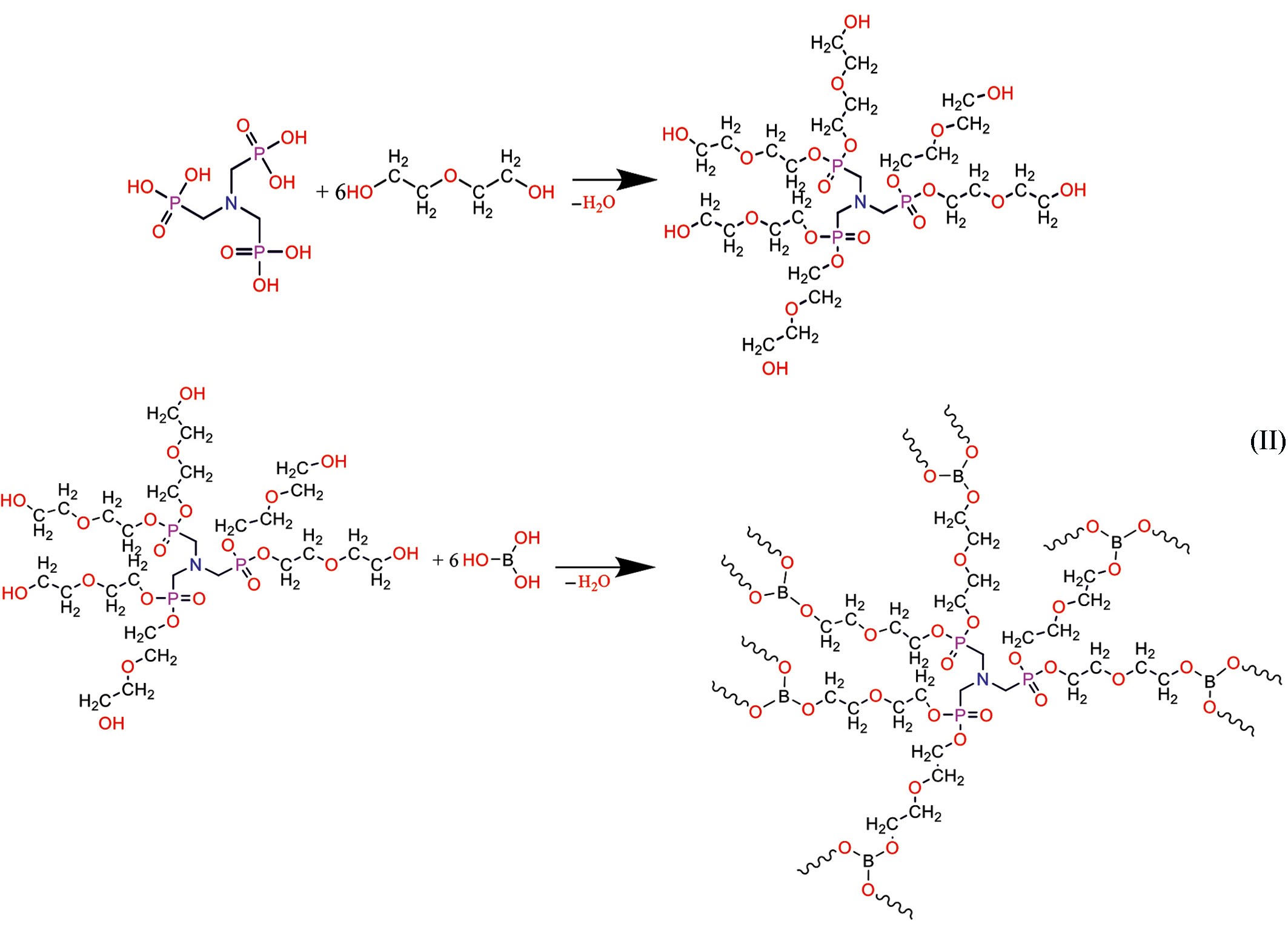 Одним из перспективных в этом плане веществ является аминотриметиленфосфоновая кислота, применяемая для получения слоистых структур с интеркалированными соединениями,1 в процессах термохимической очистки нефти и для ингибирования процессов коррозии и защиты оборудования [4]. Термолиз растворов аминотриметиленфосфоновой кислоты при температуре более 200°С приводит к появлению соединений фосфора и азота, стимулирующих процессы коксообразования полимерных материалов. Выбор этого соединения обусловлен наличием в его составе азота и реакционноспособных фосфатных групп, позволяющих дополнительно ввести бор.