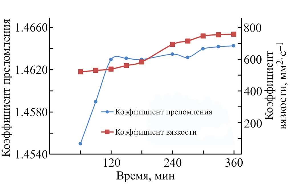 Рис. 1. Зависимость коэффициентов преломления и вязкости продукта взаимодействия аминотриметиленфосфоновой кислоты, диэтиленгликоля и борной кислоты от длительности синтеза
