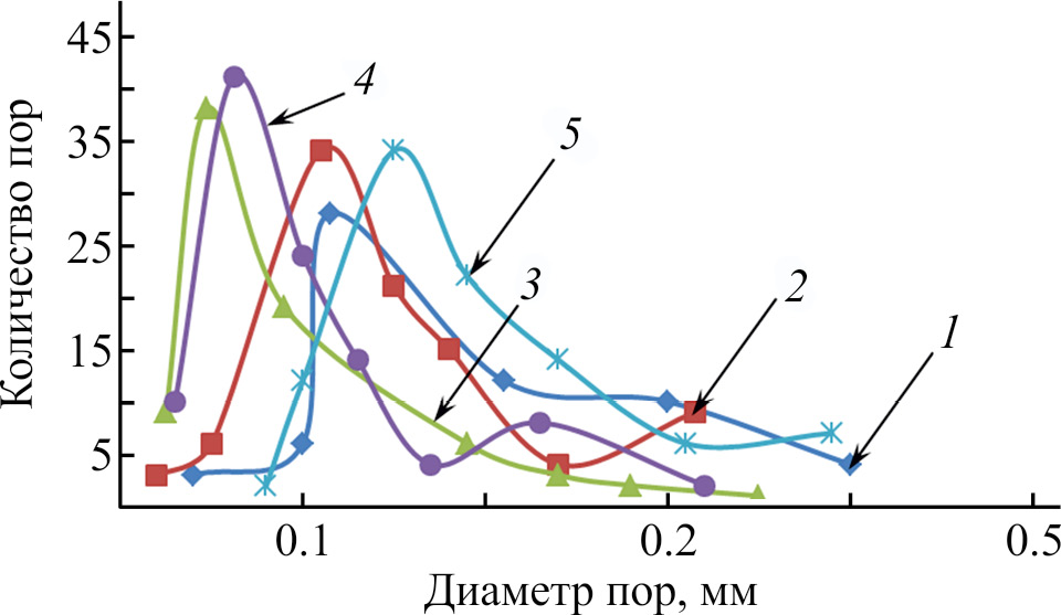 Рис. 2. Распределение пор по диаметрам в образцах. 1 — контрольный образец, без модификатора; образцы, содержащие продукт взаимодействия аминотриметиленфосфоновой кислоты, диэтиленгликоля и борной кислоты в количестве: 2 — 3 мас. ч., 3 — 5 мас. ч., 4 — 10 мас. ч., 5 — 15 мас. ч.