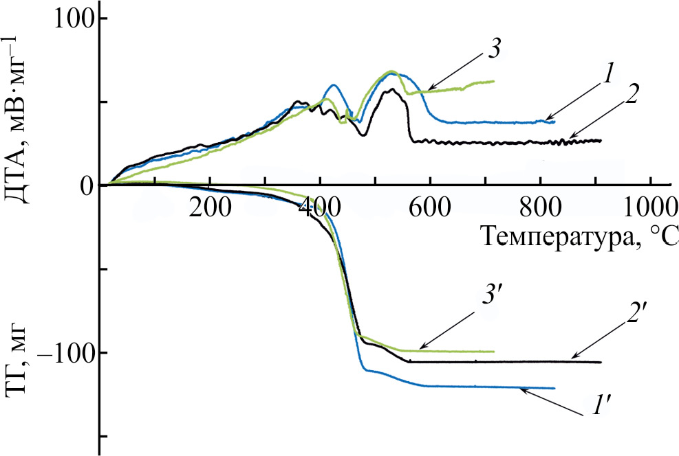 Рис. 3. Кривые дифференциального термического (1 – 3) и термогравиметрического (1ʹ – 3ʹ) анализа. 1 — контрольный образец, без модификатора; образцы, содержащие продукт взаимодействия аминотриметиленфосфоновой кислоты, диэтиленгликоля и борной кислоты в количестве: 2 — 5 мас. ч., 3 — 15 мас. ч.
